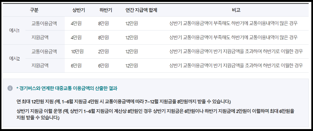 경기도에 거주하고 있는 만 13세 ~ 23세의 교통카드로 경기도 대중교통을 이용하는 청소년들을 대상으로 하고 있으며 상빈기 최대 6만 원, 하반기 최대 6만 원을 지원하여 1년 총 12만 원의 지원금을 받을 수 있습니다.