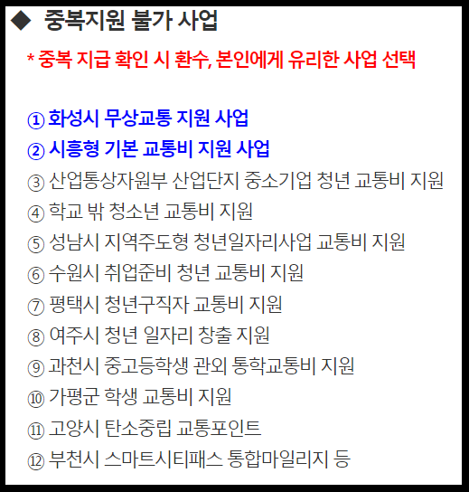 이미 시행되고 있는 비슷한 교통비 지원 사업을 지원 받아 이용하고 있는 청소년이라면 중복으로 지원을 받을 수 없습니다. 아래 사진을 통해 중복 지원이 불가한 사업을 확인하시면 좋을 것 같습니다.