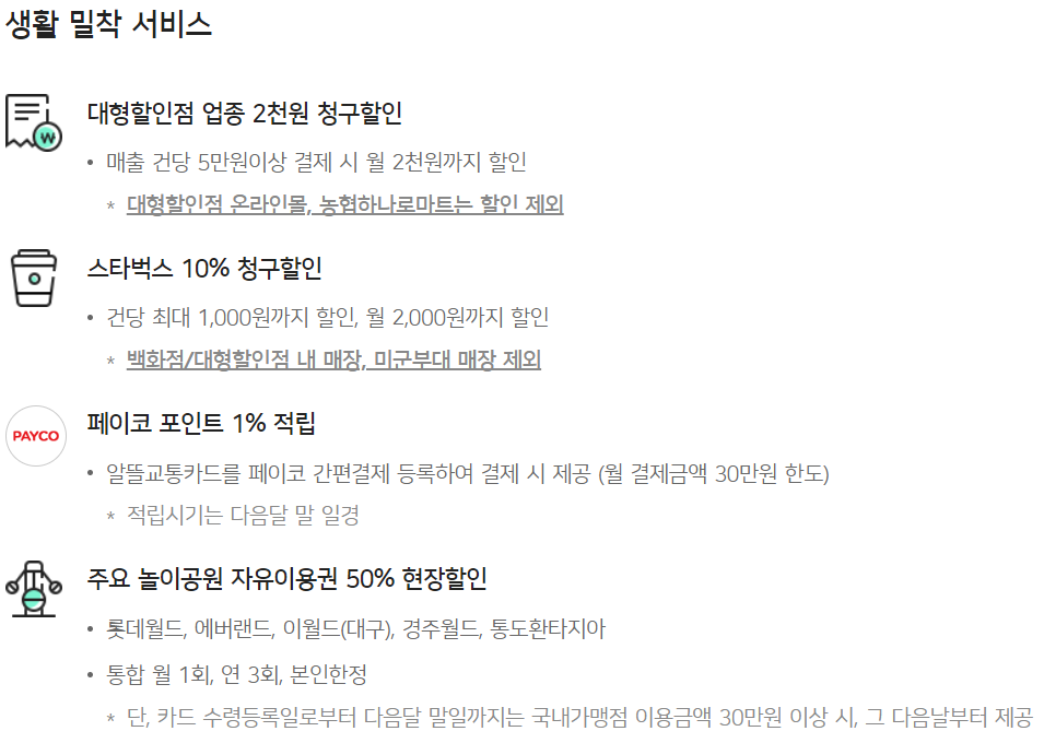 이밖에도 대형할인점, 스타벅스, 주요 놀이공원 50% 현장할인 등이 제공됩니다.