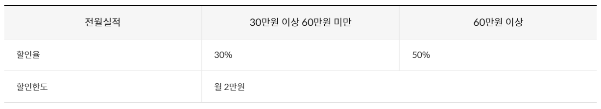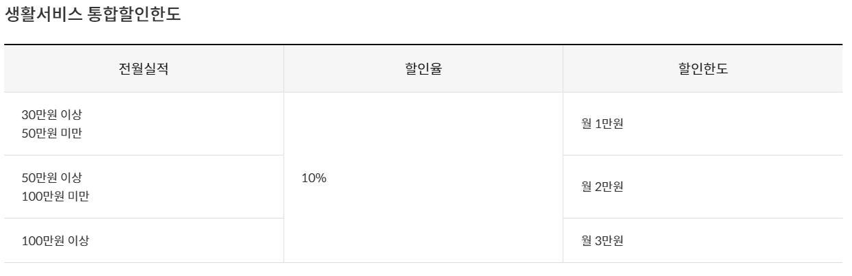 하지만 전월실적만 채운다면 최대한도까지 모두 할인을 받을 수 있다는 장점이 있습니다.