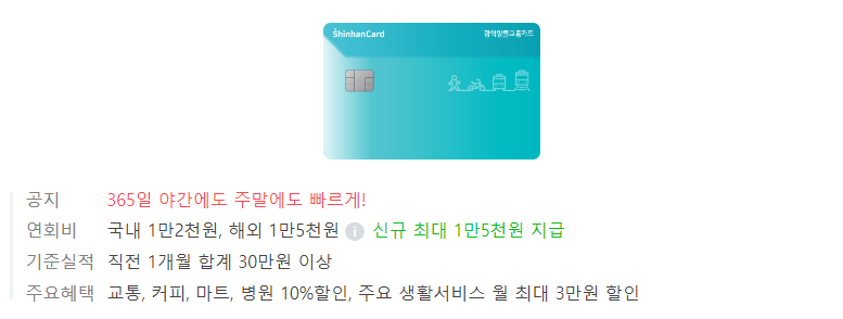 전월실적 30만 원 이상시 대중교통이나 편의점, 카페 등에서 10% 할인을 받을 수 있습니다. 연회비는 국내 12,000원, 국외겸용 15,000원입니다.