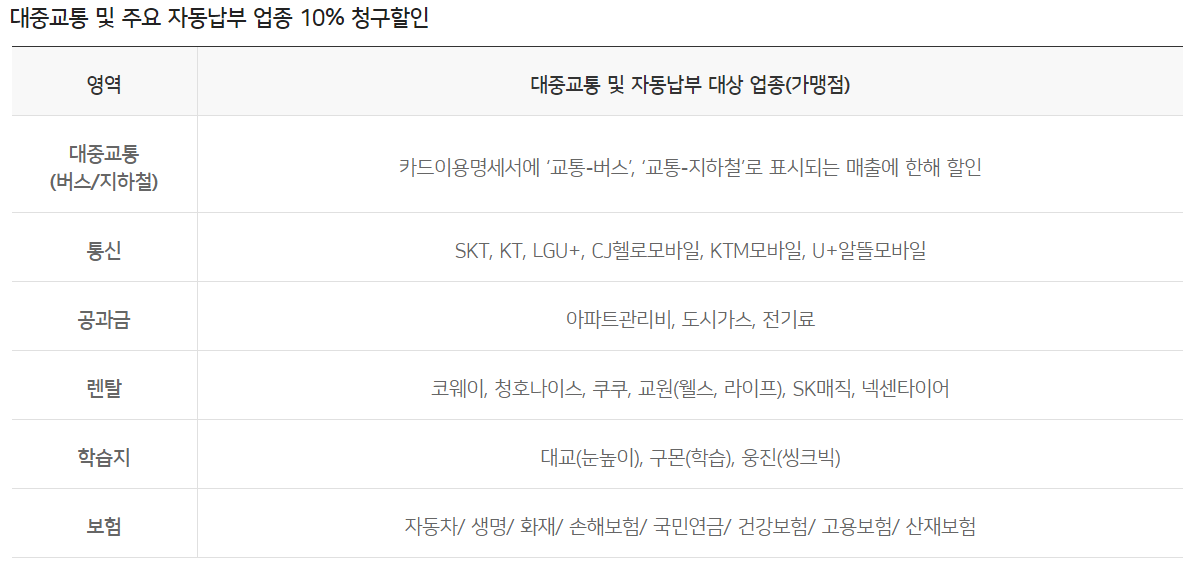 대중교통 및 자동납부 10% 청구할인이 가능한 업종은 다음과 같습니다.