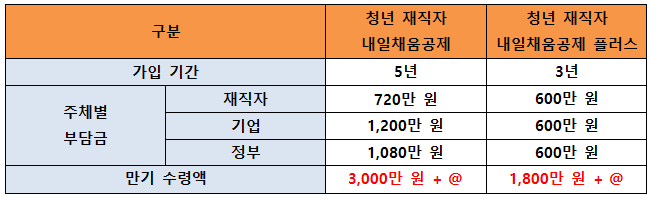 5년 가입에 3,000만 워 + @를 제공하던 재직자 내일채움공제 사업이 올해부로 플러스형으로 전환되며 가입 기간이 3년으로 줄어들었습니다. 고로 만기 수령액 역시 축소된 기간과 비례하여 1,800만 원 + @가 돼버려 목돈 마련에 대한 메리트가 크게 감소했습니다.